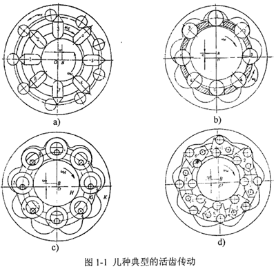 活齒少齒差行星傳動(dòng)簡稱為活齒傳動(dòng),是由K-H-V型少齒差行星齒輪傳動(dòng)演化而成的一種新型齒輪傳動(dòng),并利用一組中間活動(dòng)件——活齒來傳遞兩同軸間的回轉(zhuǎn)運(yùn)動(dòng)。常見的活齒傳動(dòng)分為推桿活齒傳動(dòng)(圖1-la)、滾柱(鋼球)活齒傳動(dòng)(圖1-1b)、套筒活齒傳動(dòng)(圖1-1c)、擺動(dòng)活齒傳動(dòng)(圖1-ld)等。因?yàn)榛铨X傳動(dòng)具有結(jié)構(gòu)緊湊、傳動(dòng)比范圍廣、承載能力大、傳動(dòng)效率高等優(yōu)點(diǎn),所以它一出現(xiàn)就引起科技工作者的廣泛注意。
