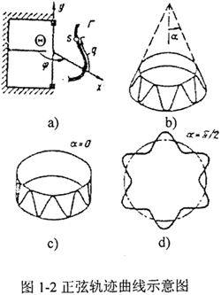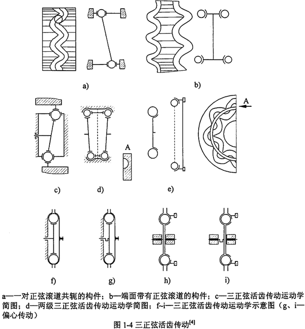 正弦活齒傳動(dòng)屬于活齒少齒差行星齒輪傳動(dòng),是一種利用鋼球和正弦滾道組成的滾動(dòng)嚙合變速裝置。按照正弦曲線軌跡所在回轉(zhuǎn)面的類型,正弦活齒傳動(dòng)可分為平面正弦活齒、圓柱正弦活齒及圓錐正弦活齒傳動(dòng)等,圖1-2所示為共扼正弦曲線軌跡的示意圖。當(dāng)φ從0到2π變化,正弦曲線Γ在回轉(zhuǎn)面上被描述出來。如果Θ代表主動(dòng)軸坐標(biāo)系,則曲線Γ表示主動(dòng)軸回轉(zhuǎn)面上的正弦曲線,若Θ代表殼體坐標(biāo)系,則曲線Γ表示殼體回轉(zhuǎn)面上正弦曲線�;剞D(zhuǎn)面可以是錐面(圖1-2b)、圓柱面(圖1-2c)、平面(圖1-2d),還可以為拋物面、雙曲面、超環(huán)面等。若按與活齒嚙合的正弦滾道數(shù)目劃分,正弦活齒傳動(dòng)可分為雙正弦活齒傳動(dòng)(圖1-3)和三正弦活齒傳動(dòng)(圖1-4)。