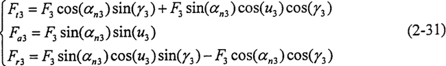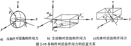 顯然F1、F2、F3組成一空間匯交力系,假設(shè)活齒在每個(gè)工作瞬時(shí)處于衡狀態(tài),根據(jù)圖2-10中各作用力的空間位置關(guān)系,可列方程如下: