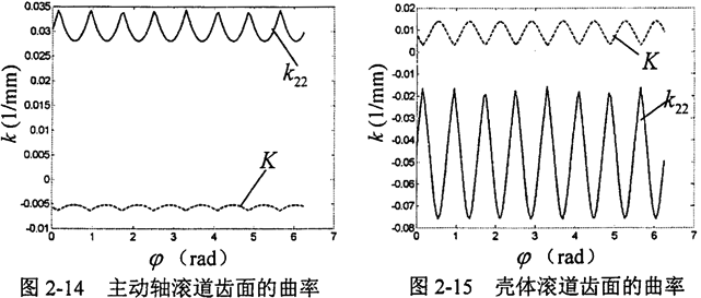 根據(jù)式(2-32),應(yīng)用Matlab編程計(jì)算得到滾道齒面與活齒接觸點(diǎn)處的主曲率與全曲率的變化曲線如圖2-14、圖2-15。從圖中可見(jiàn),主動(dòng)軸正弦滾道齒面在接觸點(diǎn)處的全曲率恒為負(fù)值,根據(jù)微分幾何中的定義,則該接觸點(diǎn)為雙曲點(diǎn),而殼體正弦滾道齒面在接觸點(diǎn)處的全碘率恒為正值,則該接觸點(diǎn)為隨圓點(diǎn)。從數(shù)值上看,曲率的變化范圍大,傳動(dòng)比較平穩(wěn)。