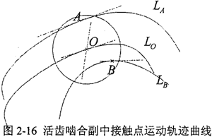 在圓柱正弦活齒傳動(dòng)的一個(gè)活齒嚙合副中,活齒與殼體及主動(dòng)軸的滾道分別在A、B點(diǎn)接觸,如圖2-16所示,接觸角近似取αn1=αn3=π/4,活齒在接觸點(diǎn)A、B的運(yùn)動(dòng)速度方向即為接觸點(diǎn)軌跡曲線LA及LB的切線方向,根據(jù)式(2-19),可知活齒與殼體接觸點(diǎn)A的運(yùn)動(dòng)軌跡曲線LA的方程: