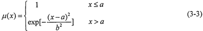 滾道齒面從完好狀態(tài)到失效狀態(tài),其許用應(yīng)力[σH]是一個漸進的衰減過程,為了更真實的反映[σH]的模糊性,本文采用降半正態(tài)分布的隸屬函數(shù)來表示[σH]。降半正態(tài)分布的隸屬函數(shù)為