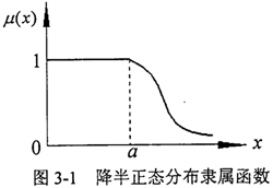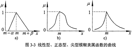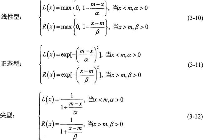 線性型參照函數(shù)在“完全屬于”和“完全不屬于”之間的中介狀態(tài)是線性變化的(圖3-3a),當x≤m-α和x≥m+β時,μ=0,說明在(m-α,m+β)區(qū)間之外的數(shù)值完全不屬于該模數(shù)數(shù)。而其他兩種類型的隸屬函數(shù)曲線兩端延伸至無窮遠(圖3-3b,c)說明整個數(shù)軸上的任何數(shù)總在一定程度上隸屬于該模糊數(shù)。在選擇參照函數(shù)時,除非有絕對的把握認為該事件發(fā)生的概率在某個范圍之內(nèi)而選擇線性參照函數(shù),否則,以選取正態(tài)型或尖型為好。