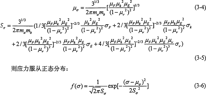 將F、∑k視為隨機變量,并近似按“3σ”法求出其均值μF、μk與標準差SF、Sk,根據(jù)文獻,彈性模量E、泊松比v均為隨機變量,且近似服從正態(tài)分布,彈性模量的變異系數(shù)對鋼而言不超過0.03,即彈性模量的標準差為6180MMPa,而泊松比的變異系數(shù)一般在2%-3%左右,則泊松比的標準差為0.009。按可靠度計算的一次二階矩原理,將齒面接觸應(yīng)力的表達式在基本變量的平均值點處展開成泰勒級數(shù),僅取級數(shù)的線性項,則可近似求得應(yīng)力的均值μa與標準差Sσ分別為: