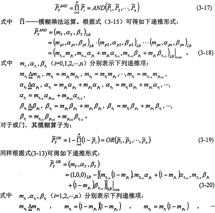 3.3.3.1模糊分析的理論基礎(chǔ) 在故障樹的模糊分析中,采用模糊數(shù)來描述事件發(fā)蘭的概率。模糊數(shù)是由概念上的模糊性或各種模糊因素的影響而造成定量處理時的不確定性。以模糊數(shù)描述概率值,帶有人的主觀性,強調(diào)了人在系統(tǒng)可靠性分析與評價中的重要性。因此,故障樹的模糊分析不僅可減少獲取事件發(fā)生概率精確值的難度,而且能結(jié)合工程中的實際經(jīng)驗和判斷構(gòu)造模糊數(shù)為隸屬函數(shù),較準確地把它們描述出來,并在一定程度上允許存在描述誤差,具有較大的靈活性和適應(yīng)性。