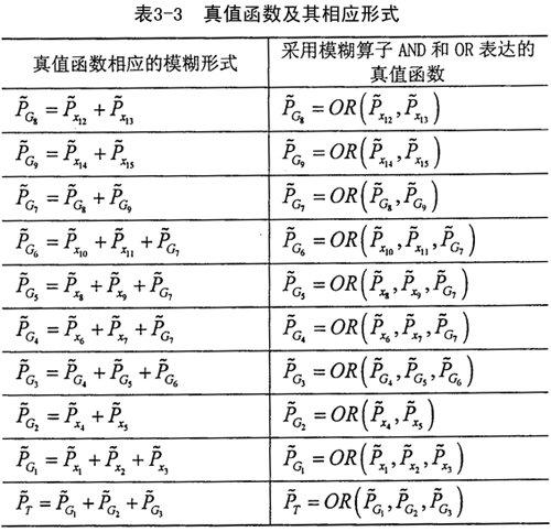 3.3.3.3圓柱正弦活齒減速器故障樹分析 根據(jù)圓柱正弦活齒減速器故障樹,用模糊算子ACD和OR描述基本事件間的邏輯關(guān)系,生成值值函數(shù)的模糊形式及用模糊算子表達的形式見表3-3。