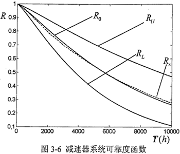 仿真的系統(tǒng)可靠度曲線Rs、擬合的可靠度曲線R0,及R0的置信上、下限曲線RU、RL如圖3-6所示。減速器可靠性仿真的誤差分析及基本元件的模式重要度如表3-6和表3-7所示。