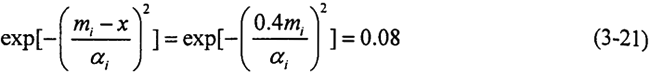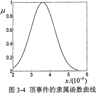 故障樹(shù)中各事件發(fā)生的概率用模糊數(shù)來(lái)表示,根據(jù)模糊數(shù)的運(yùn)算法則式(3-13)、(3-15)和模糊算子AND和OR的計(jì)算方法式(3-18)、(3-20)即可確定頂事件發(fā)生的模糊概率。假定事件發(fā)生概率Pi的參照函數(shù)為正態(tài)對(duì)稱型,其隸屬函數(shù)如式(3-11)所示,且與均值mi相差±40%的點(diǎn)x的隸屬度為0.08,則