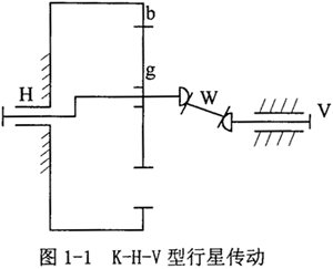 本文所研制的兩級三環(huán)減速器屬漸開線少齒差傳動形式,有必要重點(diǎn)討論一下漸開線少齒差行星齒輪傳動。當(dāng)漸開線內(nèi)嚙合圓柱齒輪副的內(nèi)齒輪和外齒輪齒數(shù)差很少時(一般為1~4個)所組成的行星齒輪機(jī)構(gòu),稱為少齒差行星齒輪傳動。如圖1-l所示的K-H-V型(也稱N型)是其主要形式,K-H-V型傳動,其內(nèi)齒圈b固定,轉(zhuǎn)臂H是輸入軸。由于它的轉(zhuǎn)動和內(nèi)齒圈的限制,行星輪g作平面運(yùn)動,即行星輪既繞內(nèi)齒圈軸線作圓周平移運(yùn)動,又繞自身軸線作回轉(zhuǎn)運(yùn)動,再用輸出機(jī)構(gòu)W把行星輪的回轉(zhuǎn)運(yùn)動傳遞給輸出軸,從而起到減速作用。