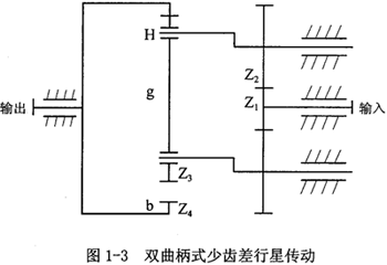 RV傳動作為一種新型傳動,由于具有良好的動、靜態(tài)特性,對其進(jìn)行的研究和應(yīng)用較為廣泛。雙曲柄式少齒差行星傳動則將輸入運(yùn)動和輸出運(yùn)動分別由中心輪和行星輪承擔(dān),如圖1-3所示。該機(jī)構(gòu)一方面省取了輸出機(jī)構(gòu)W,避免了由輸出機(jī)構(gòu)所帶來的弊病,另一方面用一個平行四邊形機(jī)構(gòu)(雙曲柄)代替了轉(zhuǎn)臂H,設(shè)置了同步嚙合的定軸齒輪副,經(jīng)減速后再將運(yùn)動輸送給少齒差輪系,這樣可獲得更大的速比,使機(jī)構(gòu)更為緊湊和有效;當(dāng)總速比相同時,動軸上齒輪的轉(zhuǎn)速較低、運(yùn)轉(zhuǎn)比較平穩(wěn)、動載荷和噪音較小。
