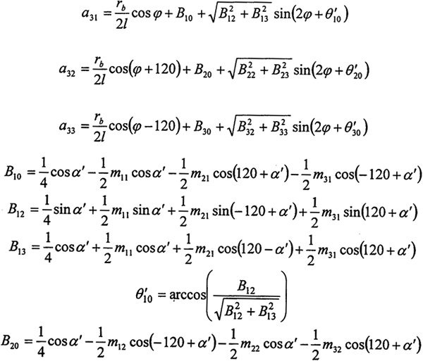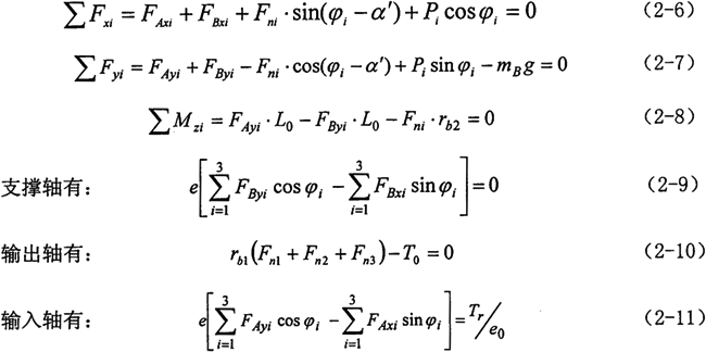 由上式可看出,任意時(shí)刻各環(huán)板上作用的嚙合力是不相等的,且是與轉(zhuǎn)角、環(huán)板和曲柄軸結(jié)構(gòu)尺寸、壓力角以及偏心尺寸有關(guān)的復(fù)雜函數(shù),假設(shè)各嚙合力相等或者是成一簡單的函數(shù)關(guān)系都是與實(shí)際嚴(yán)格不符的。若需要用簡潔的函數(shù)關(guān)系加以描述,應(yīng)首先利用上式求出輸出軸旋轉(zhuǎn)一周時(shí)的數(shù)個(gè)嚙合力的表達(dá)式,這里不作詳細(xì)的討論。