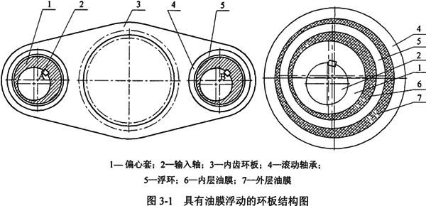 由于三環(huán)減速器充分地利用了功率分流和內(nèi)嚙合多齒接觸的原理,因此,三環(huán)減速器的承載能力較大。上一章的受力分析和振動分析表明:采用三片內(nèi)齒環(huán)板偏心之間呈180°相位角的布置形式,能夠?qū)崿F(xiàn)慣性力和慣性力矩的完全平衡,又使得嚙合力對振動的影響減小,采用雙軸輸入又可使三環(huán)減速器各環(huán)板所受的嚙合力相等,避免機(jī)構(gòu)的過死點(diǎn)的沖擊,改善高速軸的受力情況,提高傳動系統(tǒng)的效率。在雙軸輸入和完全平衡狀態(tài)下,嚙合力對輸出軸支撐軸承的作用力和作用力矩也完全平衡。由于不可避免的制造和安裝誤差及動力傳遞過程中出現(xiàn)的零部件變形,使得三片內(nèi)齒環(huán)板之間的作用載荷分配不均勻,引起動載荷增加,導(dǎo)致振動加劇,造成齒面點(diǎn)蝕、軸承損壞、齒輪箱發(fā)熱,甚至發(fā)生事故。本文提出的同步帶傳動作為一級傳動的完全平衡均載減振的三環(huán)減速器,可實(shí)現(xiàn)減速器齒輪傳動部分的慣性力和慣性力矩完全平衡和三環(huán)傳動的雙軸輸入,克服了死點(diǎn)位置沖擊和振動較大的問題。該減速器的油膜浮動實(shí)現(xiàn)了三蘇減速器均載和減振。由于本文提出的油膜浮動方案是在旋轉(zhuǎn)的偏心軸表面與轉(zhuǎn)臂軸承之間插入一個圓柱套筒形成的,并受到一個動載荷的作用,其動力學(xué)研究尚未見到相關(guān)的報道,本章對油膜浮動動力學(xué)的有關(guān)問題進(jìn)行研究。