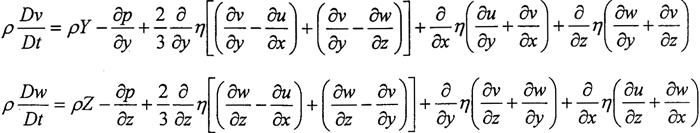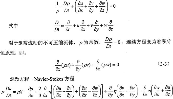 式中u,v,w——分別為沿坐標(biāo)x, y,z方向的流速;X,Y,Z——體積力分量;p——密度;η——粘度;t——時間。