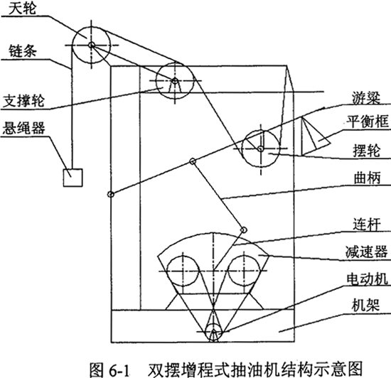雙擺增程式抽油機的結構如圖6-1所示。其工作原理為:電機的高速旋轉運動,通過兩級三環(huán)減速器、四連桿機構轉變成游梁的往復擺動,游梁上的擺輪隨游梁一起擺動,再通過鏈條纏繞滑輪組傳動并帶動光桿上下運動,實現(xiàn)抽油過程。該機是利用鏈條行程是擺輪行程兩倍的原理,實現(xiàn)增程的。