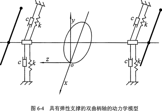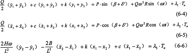 設:彈性支撐的剛度和阻礙尼分別為k和c,輸出軸與曲柄和平衡塊構成的轉子的主中心軸慣性矩為H,赤道慣性矩為B,質量為Q,R為中心對回轉軸線的偏心距,L中心到支撐點的距離,左右彈性支撐上相應兩點的坐標分別為y1,x1和y2,x2。λ1,λ2,λ3,λ4為載荷分配不均勻的影響系數(shù),可由均載試驗的結果或力平衡方程求得,若均載效果好,均載系數(shù)接近1,λ1,λ2,λ3,λ4的值近似為0。