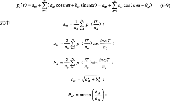 方程右端的激勵精圖治振力是復雜周期函數(shù),依據(jù)傅里葉級數(shù)展開原量,可將非簡諧的周期性激振力展成多個頻率成整倍數(shù)關系的簡諧激振力函數(shù)之和。由前面分析知,連桿力分力、慣性力和曲柄軸扭矩均為曲柄轉角的函數(shù),由于曲柄軸轉速恒定,故,激振力為時間的函數(shù),設為Pl(t),(l=1,2,3,4)其周期為T,考慮到激振力函數(shù)復雜且連桿力中的懸點載荷W難以用數(shù)學表達式描述,積分難以實現(xiàn),采用求和的方法求系數(shù)更為有效,以n0作為一個周期的等分區(qū)間數(shù)(一般取n0=36),時間區(qū)間為△t=T/n0,則它的傅里葉級數(shù)為: