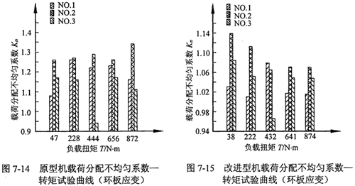 對兩級三環(huán)減速器的原型機(jī)和改進(jìn)型機(jī)的環(huán)板齒根彎曲應(yīng)力和環(huán)板薄弱部位的應(yīng)力進(jìn)行了測試,并討論了載荷均衡情況。結(jié)果表明:改進(jìn)型機(jī)具有很好的均載效果,載荷分配不均勻系數(shù)由均載前的1.33降為均載后的1.07。這個(gè)數(shù)值較基本型三環(huán)減速器的載荷分配不均勻系數(shù)1.7小的多。