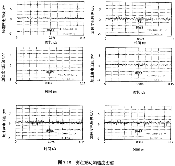 圖7-19所示是一組輸出轉(zhuǎn)矩為875N.m,轉(zhuǎn)速為1080r/min工況時(shí)的實(shí)測振動加速度結(jié)果,加速度最大值及對應(yīng)的時(shí)間標(biāo)記在圖上。(1×e-1v代表1m/s2)