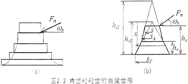 本文將輪齒的齒廓劃分為二個梯形,用二個梯形的彎曲變形、剪切變形、由輪齒基體的彈性傾斜所引起的輪齒的的變形以及輪齒的材料壓縮變形來模擬內(nèi)齒的輪齒變形,故稱之為二梯形當量齒形法。這樣處理與Marmol的方法相比更接近實際的齒廓形狀,而且與外嚙合輪齒的梯形加矩形模型正好對應(yīng)。下面就介紹二梯形當量齒形法,將內(nèi)齒輪輪齒劃分為上、下二個梯形,如圖2.2b所示。
