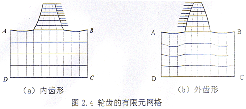 為了與上述方法進行數(shù)值比較,在此對內(nèi)、外齒輪的輪齒進行有限元法分析。輪齒的有限元網(wǎng)格劃分見圖2.4,輪齒網(wǎng)格的輪廓盡量模擬自然邊界�?紤]到彈性基座的傾斜對柔度的影響較大,因此本文取AB=6m,AD=3.25m(m是齒輪的模數(shù))。載荷的分布與齒對的接觸情況有關(guān),對于齒輪聯(lián)軸器齒面接觸比較特殊。本文將載荷均勻地分布于工作齒面上。節(jié)圓處的切向柔度為qt,相應(yīng)的法向柔度[89]q=qtcos2α。計算結(jié)果見表2.3.