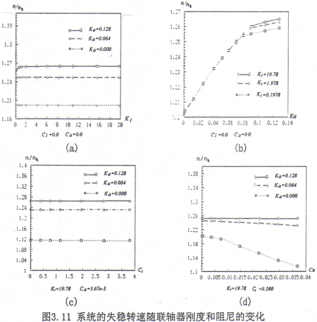 從圖3.11c可見在一定的范圍之內(nèi),齒輪聯(lián)軸器橫向內(nèi)阻尼的變化對系統(tǒng)的失穩(wěn)轉(zhuǎn)速幾乎沒有影響。由圖3.11d可知,隨齒輪聯(lián)軸器轉(zhuǎn)角內(nèi)阻尼的增加失穩(wěn)轉(zhuǎn)速減小,減少的幅度與系統(tǒng)的轉(zhuǎn)角剛度有關(guān),轉(zhuǎn)角剛度取大值時,系統(tǒng)的失穩(wěn)轉(zhuǎn)速變化甚微,而取小值時,則變化明顯。一般而言,對于確定的齒輪聯(lián)軸器類型,如果輪齒間的潤滑充分對中良好,則轉(zhuǎn)角內(nèi)阻尼變化不會太大。所以系統(tǒng)的失穩(wěn)轉(zhuǎn)速也不會有明顯的變化。但當(dāng)潤滑不充分,齒輪聯(lián)軸器對中不良時,轉(zhuǎn)角內(nèi)阻尼的變化較大,從而會引起系統(tǒng)失穩(wěn)轉(zhuǎn)速生產(chǎn)較大的變化。