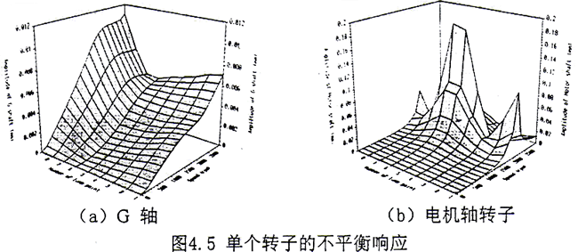 按此標(biāo)準(zhǔn),在G軸和電機(jī)軸軸承處的振動(dòng)不能大于63.8(μ)。從圖4.5a~4.5b和圖4.6a~4.6f可見(jiàn),不論是用單軸還是用耦合系統(tǒng)來(lái)計(jì)算,除了在共振區(qū)域內(nèi),上述振動(dòng)標(biāo)準(zhǔn)完全滿足。