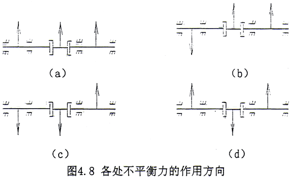 在實(shí)際系統(tǒng)中,不平衡力的作用方向是無(wú)法預(yù)知的,不妨設(shè)系統(tǒng)不平衡力的作用方向分別如圖4.8a~4.8d所示。各處不平衡量同上。計(jì)算了在3處同時(shí)具有不平衡力,耦合系統(tǒng)的不平衡響應(yīng)。結(jié)果見(jiàn)圖4.9a~4.9d。從中可以看出,不平衡力作用方向的不同對(duì)G軸兩側(cè)的支承軸承有一定的影響,但影響不大,對(duì)電機(jī)軸兩側(cè)的支承軸承則幾乎沒(méi)有任何影響。