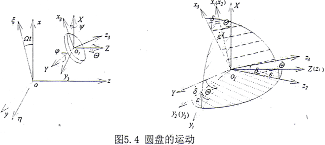 圓盤的運(yùn)動(dòng)可分解成隨其質(zhì)心的平動(dòng)和繞質(zhì)心的轉(zhuǎn)動(dòng)。質(zhì)心o1的平動(dòng)位移為(xc,yc),不計(jì)沿z軸方向的運(yùn)動(dòng)。圓盤繞質(zhì)心的轉(zhuǎn)動(dòng)可用三個(gè)歐拉角來表示,如圖5.4所示。設(shè)o1XYZ是與oxyz平行的坐標(biāo)系。o1XYZ坐標(biāo)系的單位矢量為
