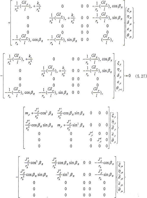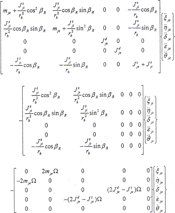 半齒輪聯(lián)軸器系統(tǒng)的動(dòng)能包括內(nèi)外齒輪的平動(dòng)動(dòng)能和轉(zhuǎn)動(dòng)動(dòng)能;彈性勢(shì)能包括左右軸段的彈性勢(shì)能和半齒輪聯(lián)軸器的彈性勢(shì)能;耗散函數(shù)包括內(nèi)外齒輪之間的橫向內(nèi)阻尼和轉(zhuǎn)角內(nèi)阻尼,由于扭轉(zhuǎn)內(nèi)阻尼較小可將其忽略,具體的分析過程可參見第三章3.2.2和3.2.3節(jié)。這樣取q=ξje,ηje,δje,εje,θje,ξji,ηji,δji,εji為廣義坐標(biāo),將以上的約束方程(5.26)式代入半齒輪聯(lián)軸器系統(tǒng)的動(dòng)能,勢(shì)能及耗散函數(shù)中,消去多余的變量θji,再由拉格朗日方程就可以得到在齒輪嚙合處的運(yùn)動(dòng)微分方程。由于推導(dǎo)過程比較冗長(zhǎng),在此僅列出最終的運(yùn)動(dòng)微分方程。對(duì)于小偏離情況,將其中的高階小量略去,則對(duì)于第j個(gè)結(jié)點(diǎn)(其中外齒輪下標(biāo)為e,內(nèi)齒套下標(biāo)為i)