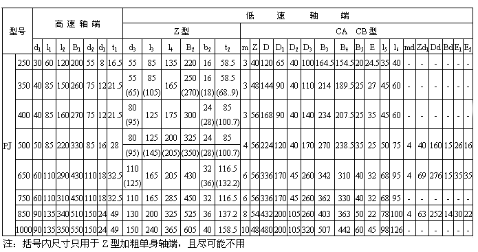 PJ型減速器輸出軸端的最大容許徑向載荷(工作級(jí)別M5)
