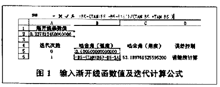 如圖1 所示,選取任意單元格(圖l中為B5 ) 輸人初始值(本例αo = 0.6 ),用迭代公式(5)在單元格B6 中輸人迭代計算公式:= B5-(TAN(B5)-B5-$A$2)/(TAN(B5)*TAN(B5))確認(rèn),在單元格C6 中輸人弧度值換算角度值公式:= B6*180/PIO 確認(rèn),在單元格D6中輸人誤差控制表達(dá)式:=IF(ABS( B5-B6)<10^(-7), “終止計算”, “請繼續(xù)計算”)確認(rèn):